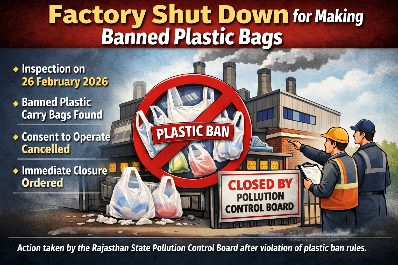 Ncrkhabar@Bhiwadi. राजस्थान राज्य प्रदूषण नियंत्रण बोर्ड ने कारोली औद्योगिक क्षेत्र में प्रतिबंधित प्लास्टिक कैरी बैग बनाने वाली एक फैक्ट्री के खिलाफ कार्रवाई करते हुए उसका कंसेंट टू ऑपरेट रद्द कर दिया है और उद्योग को तत्काल प्रभाव से बंद करने के निर्देश जारी किए हैं।