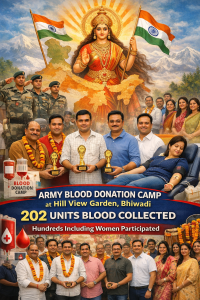 Ncrkahabar@Bhiwadi. थड़ा गांव स्थित हिल व्यू गार्डन सोसायटी परिसर के एनर्जी क्लब में भारतीय सेना के घायल सैनिकों की सहायता के लिए भव्य रक्तदान शिविर का आयोजन किया गया। हिल व्यू गार्डन आरडब्ल्यूए के महासचिव धर्मेंद्र गौतम के नेतृत्व में आयोजित इस शिविर में भारतीय सेना के सशस्त्र सेना आधान केंद्र, दिल्ली छावनी की टीम ने सूबेदार सुधांशु कुमार और हवलदार सुरिन्दर स्वामी के नेतृत्व में रक्त एकत्रित किया। शिविर में कुल 202 यूनिट रक्त एकत्रित किया गया। इस दौरान बड़ी संख्या में युवाओं और महिलाओं ने रक्तदान कर देश सेवा का संदेश दिया।